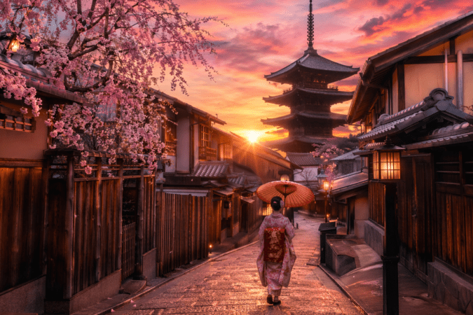 La città è rinomata per i suoi incantevoli giardini zen, le cerimonie del tè, i kimono, le geishe del quartiere Gion e le antiche case di legno (machiya).